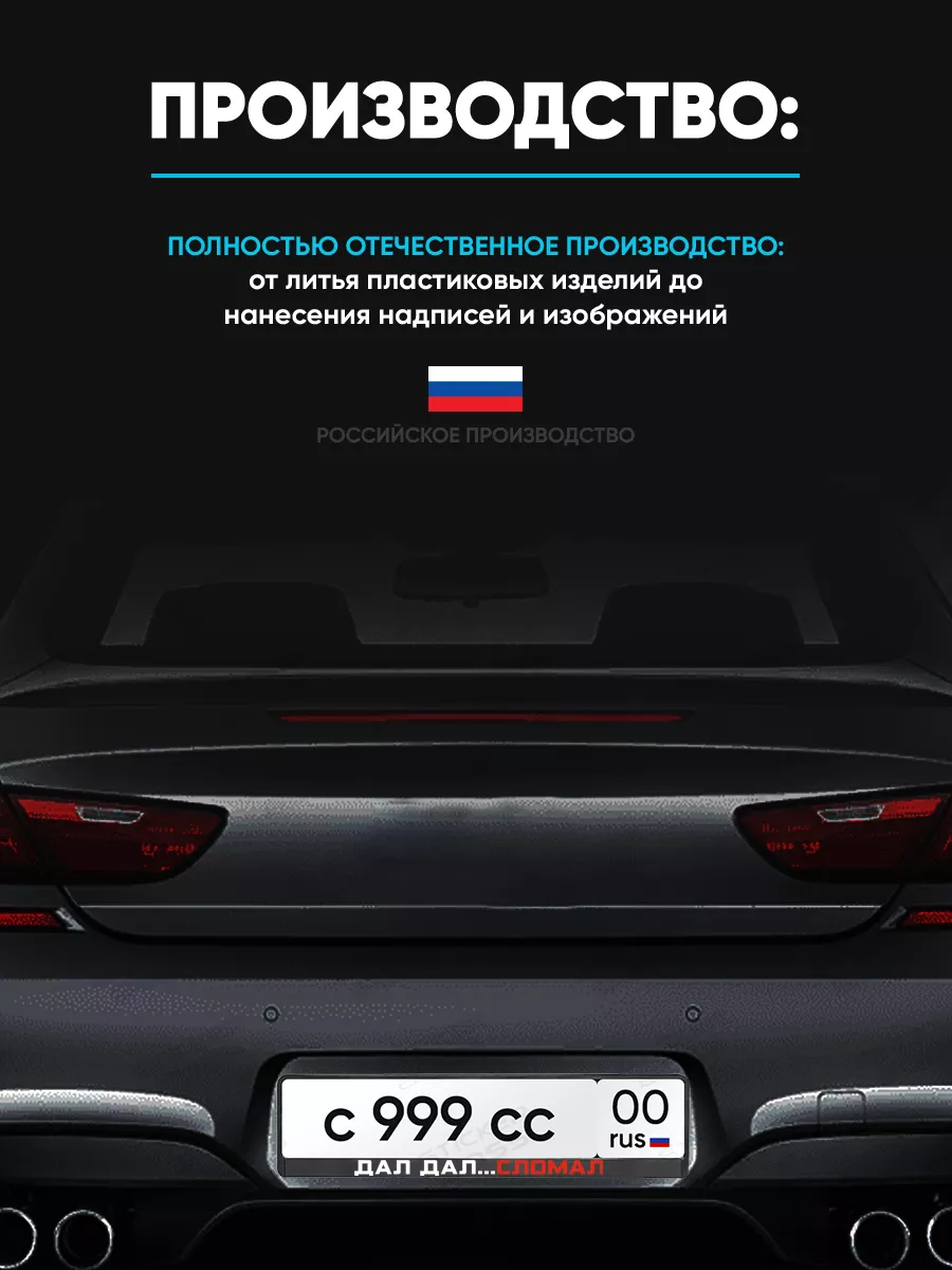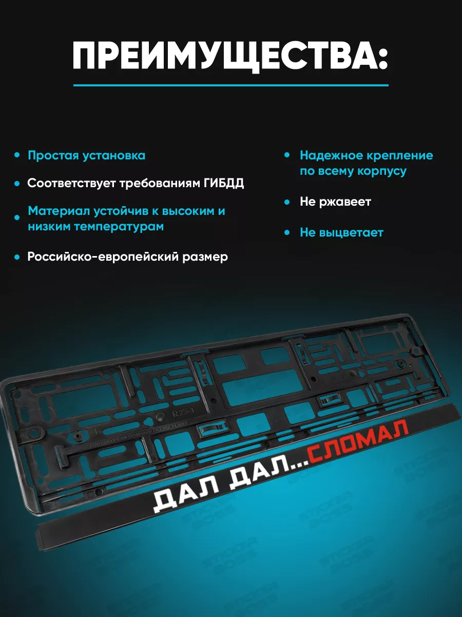 Рамки для гос номеров 2 шт с надписью Дал Сломал арт.0343 представляют собой универсальное решение для крепления номерного знака автомобиля и придания индивидуального стиля вашему авто. Рамки выполнены из ABS-пластика, что обеспечивает прочность и долговечность изделия. Печать на лицевой стороне выполнена методом УФ-печати и отличается устойчивостью к воздействию погодных условий и со временем не выцветает. Эта пара рамок подходит практически для любой марки автомобиля, а стиль Stickerboss подчеркивает дизайн вашего авто. В комплект входит две рамки, которые можно легко установить и надежно закрепить на бампере. Такой автотовар может стать отличной идеей для подарка другу.