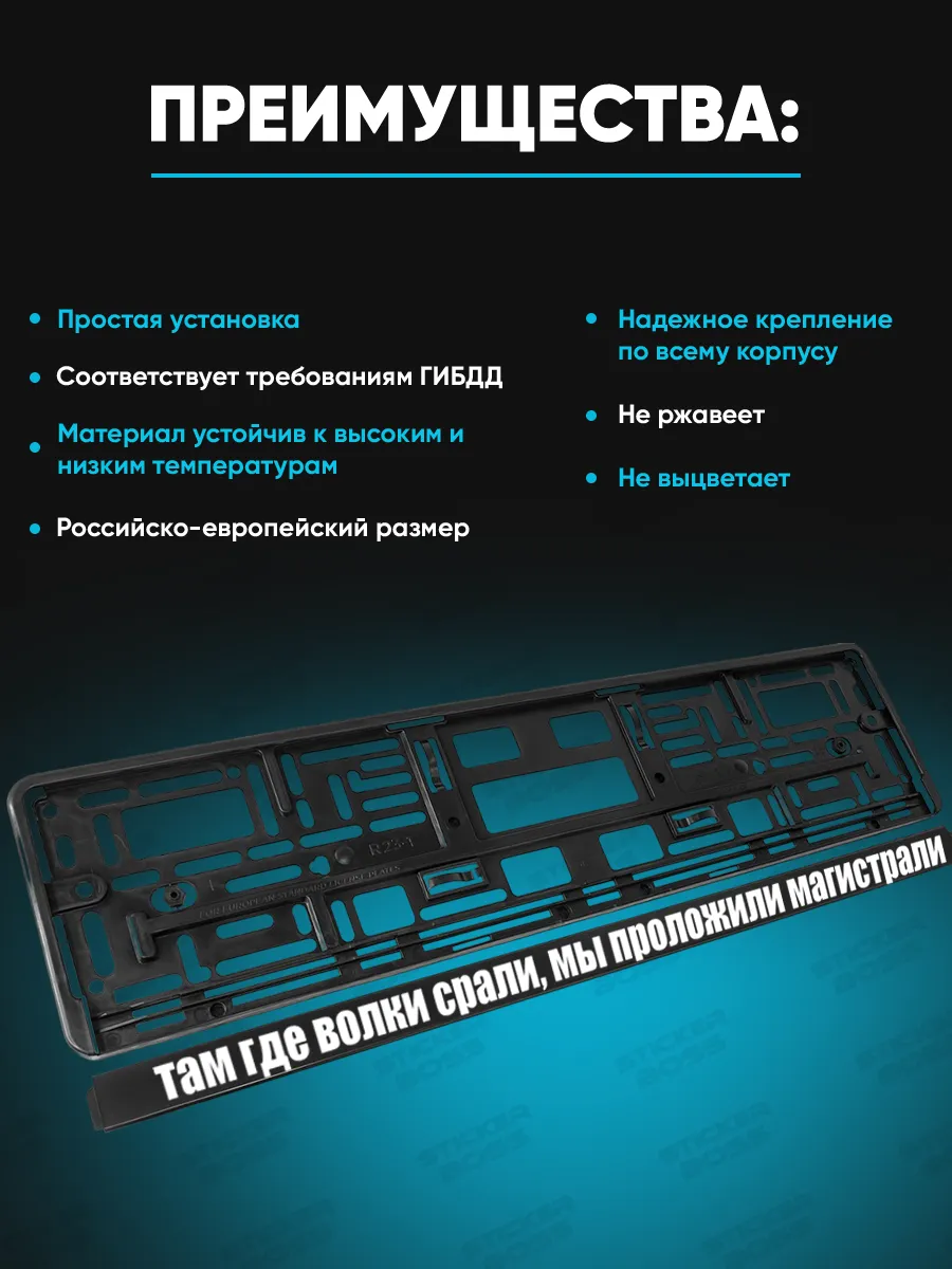 Универсальная рамка для номера автомобиля 52x13 см из ABS-пластика с передней печатью методом УФ-печати, устойчивой к погоде и выцветанию. В наборе 2 шт., совместима с российско-европейским размером ГОС номера и подходит для большинства марок автомобилей. Можно выбрать надписи по вкусу в ассортименте Stickerboss.