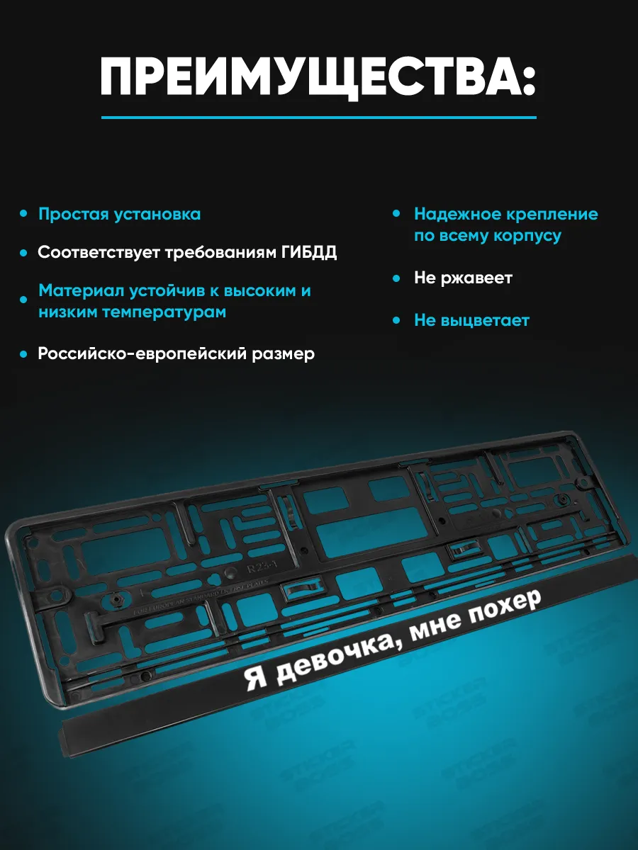 Универсальная рамка для номера автомобильного знака размером 52×13×1 см из ABS-пластика предназначена для защиты и украшения номера на большинстве легковых автомобилей. На лицевой стороне применена стойкая УФ-печать, выдерживает погодные условия и не выцветает со временем. В комплект входит 2 штуки рамок, что позволяет заменить оба номера или установить две одинаковые рамки на разные машины. Изделие производится под брендом Stickerboss в России.