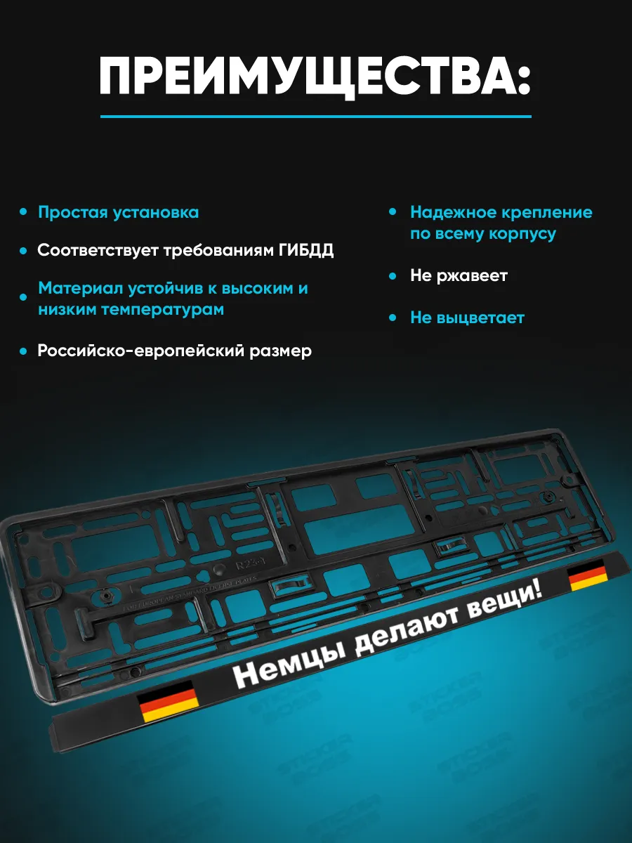 Универсальная рамка для номера автомобиля 52x13x1 см изготовлена из ABS-пластика высшего качества. Передняя сторона рамки украшена печатью методом УФ-печати, которая устойчива к погодным условиям и не выгорает со временем. Принты и надписи выполнены в духе бренда Stickerboss, что подчеркивает стиль вашего авто. Рамка обеспечивает крепление номера и одновременно служит элементом автомобильного дизайна. Легко устанавливается: крепление надежное, рамка плотно прилегает к бамперу и прослужит длительный срок. Такой автотовар может стать приятным подарком. Соответствует требованиям ГИБДД, имеет российско-европейский размер. В каталоге Stickerboss можно подобрать варианты с надписью по вкусу.