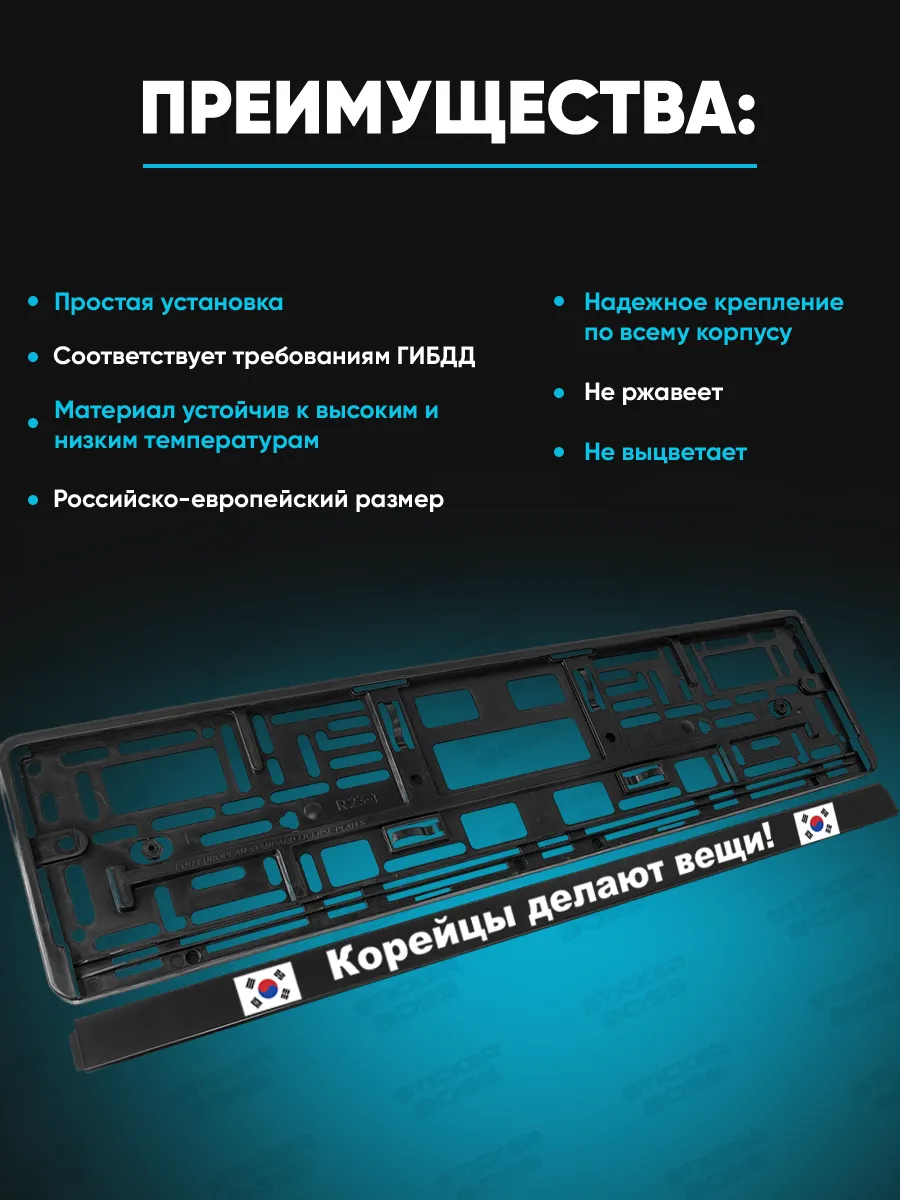 Универсальная рамка для гос номера автомобиля выполнена из ABS-пластика и рассчитана на крепление стандартного размера 52х13х1 см. На лицевой стороне нанесено изображение методом УФ-печати, что обеспечивает стойкость к ветру, снегу и солнечному ультрафиолету. Накладки и надписи сохраняют цвет со временем, а сам товар относится к продукции Stickerboss. В комплект входит 2 рамки, что удобно для замены или использования на разных авто. Конструкция соответствует требованиям ГИБДД и подходит под российско-европейский размер номера. Рамки универсальны по маркам автомобилей и подойдут практически каждому автомобилю. Автомобильный аксессуар способен подчеркнуть стиль машины и служить надежной защитой номерного знака.