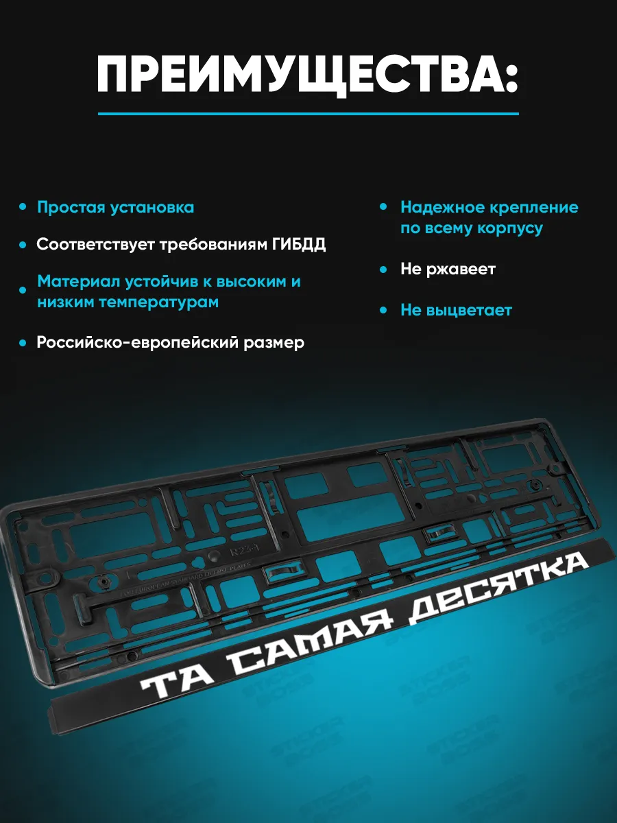 Рамка для номера 2шт с надписью Та самая десятка арт.1871 предназначена для быстрой замены номерного знака и добавления стильного акцента автомобилю. Изготовлена из ABS-пластика, лицевой стороной с УФ-печатью, что обеспечивает стойкость к солнечному свету и неблагоприятным погодным условиям. Конструкция универсальная и подходит практически для любой марки автомобиля; размер рамки 52×13×1 см соответствует российско-европейскому формату и требованиям ГИБДД. В комплект входит две рамки, выполненные в фирменном стиле Stickerboss, что повышает заметность вашего авто и соответствует бренду Stickerboss.