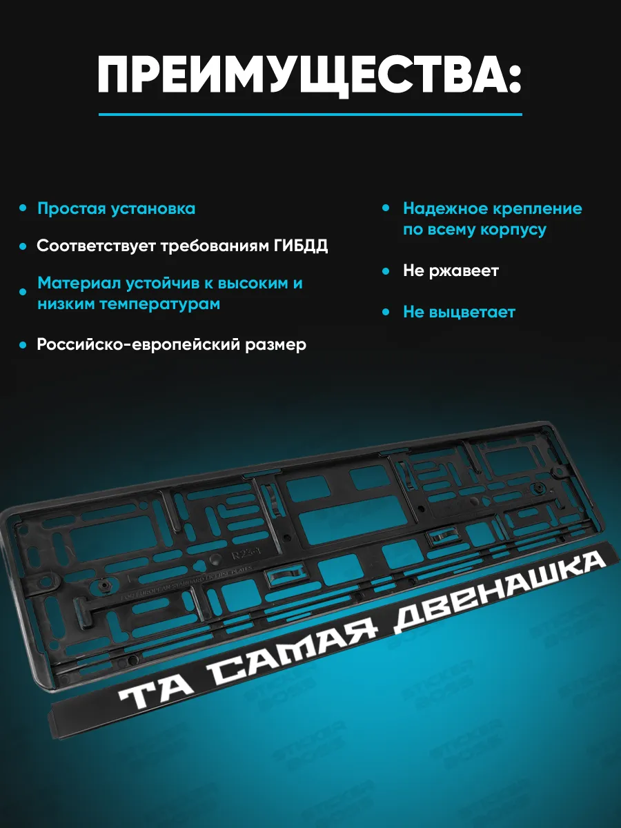 Эта пара рамок для номерного знака выполнена из прочного ABS-пластика и рассчитана на универсальное применение. На лицевой стороне применена качественная УФ-печать, которая не выцветает под воздействием солнечных лучей и неблагоприятных погодных условий. Рамки добавляют авто стилю и соответствуют требованиям ГИБДД, имеют Российско-европейский размер, что обеспечивает совместимость с большинством автомобилей. Комплект состоит из двух рамок, изготовленных в брендовом стиле Stickerboss.