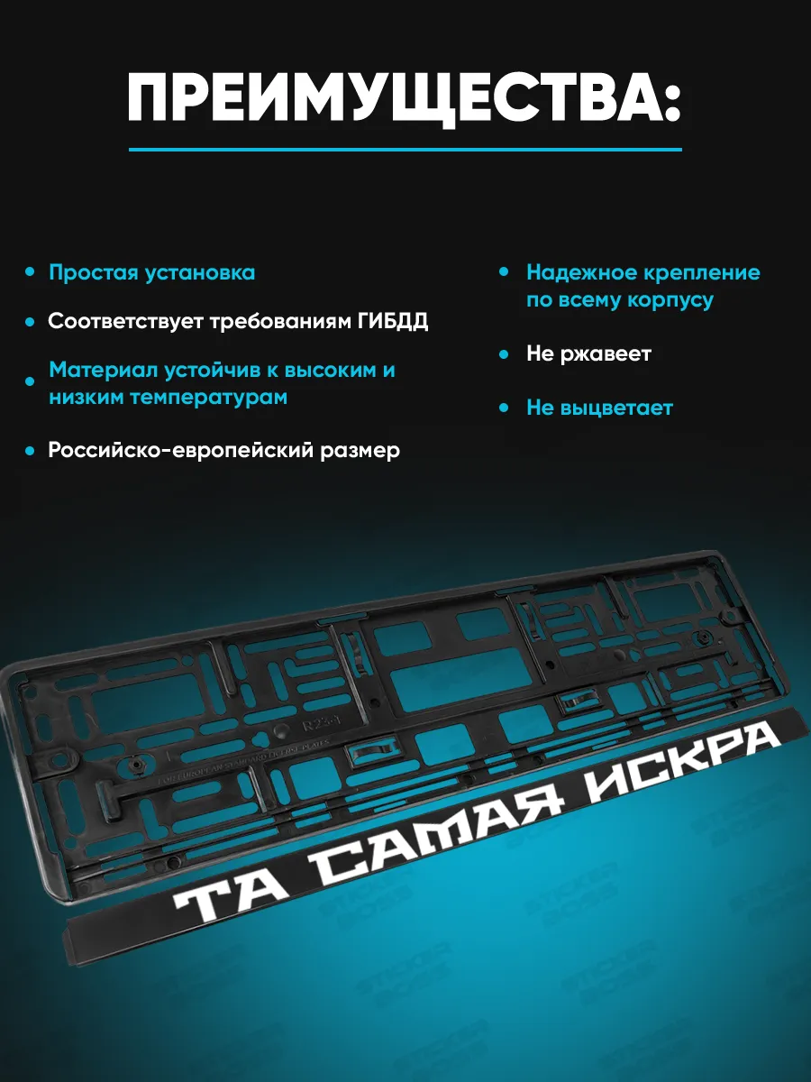 Универсальная рамка для номера автомобиля выполнена из ABS-пластика и рассчитана на размер 52×13 см. В набор входит две рамки. Лицевая сторона выполнена УФ-печатью, которая устойчива к погодным условиям, не выцветает и не выгорает со временем. Принты и надписи соответствуют стилю бренда Stickerboss, что подчеркивает внешний вид автомобиля. Эти рамки не только крепят номер, но и придают автомобилю индивидуальность. Конструкция соответствует требованиям ГИБДД и имеет российско-европейский размер; подходят для большинства марок.