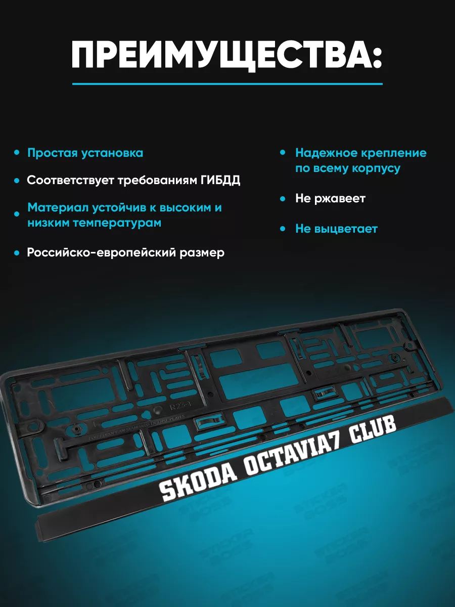 Рамки для гос номеров 2 шт с надписью Skoda Octavia арт.0303 предназначены для крепления номерного знака и добавления индивидуального стиля вашему автомобилю. Изготовлены из ABS-пластика и покрыты УФ печатью, которая устойчива к солнечным лучам, влаге и перепадам температур. Набор включает две рамки, совместимые с российско-европейскими стандартами размера. Бренд Stickerboss подчёркивает качество и долговечность продукции.