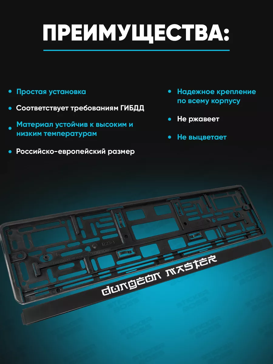 Рамки для гос номеров 2 шт с надписью Dungeon master предназначены для замены стандартной рамки на большинстве автомобилей. Аксессуар выполнен из ABS-пластика черного цвета и рассчитан на длительную службу в любых условиях. Печать выполнена методом УФ-печати, что обеспечивает стойкость к ультрафиолету, не выцветает со временем и не царапается при эксплуатации. На лицевой стороне можно разместить декоративную надпись Dungeon master, которую можно заменить в каталоге Stickerboss. Такие рамки соответствуют российско-европейскому размеру и требованиям ГИБДД, поэтому подойдут для большинства марок авто. В комплект входит две рамки, что делает покупку выгодной и удобной.