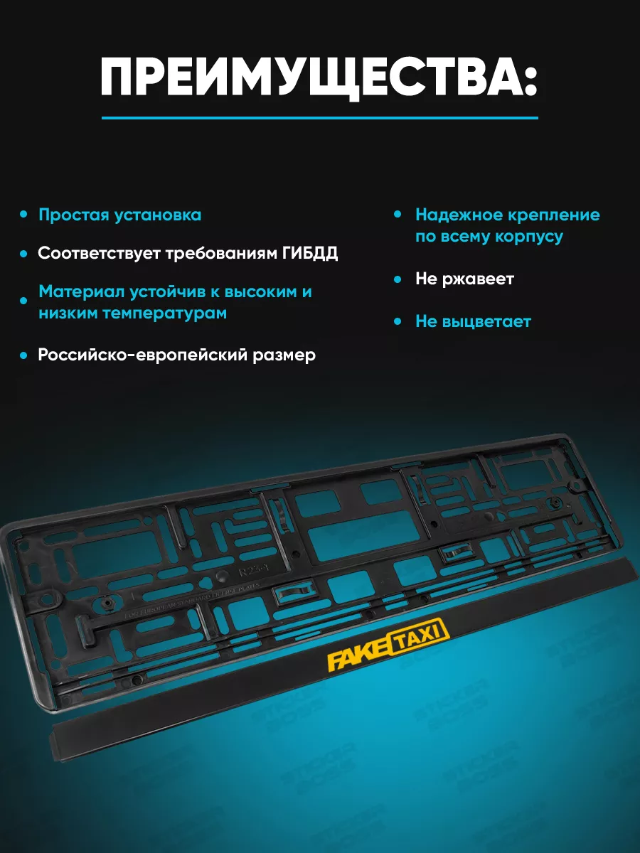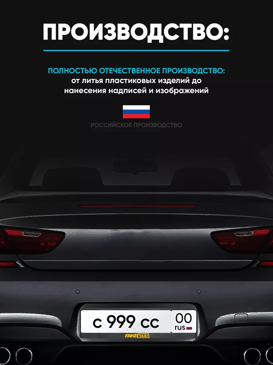 Изготовлены из abs-пластика, универсальны по марке автомобиля. На лицевой стороне применена УФ-печать, которая устойчива к дождю, снегу и солнечным лучам, не выгорает со временем. В набор входит 2 рамки с надписью Fake Taxi.