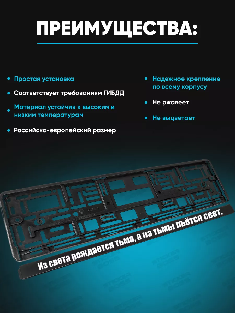 Подойдут для установки на номерной знак любого автомобиля; рамки обеспечивают стабильное крепление и стильный внешний вид. В магазине Stickerboss можно выбрать рамку с надписью по вкусу.