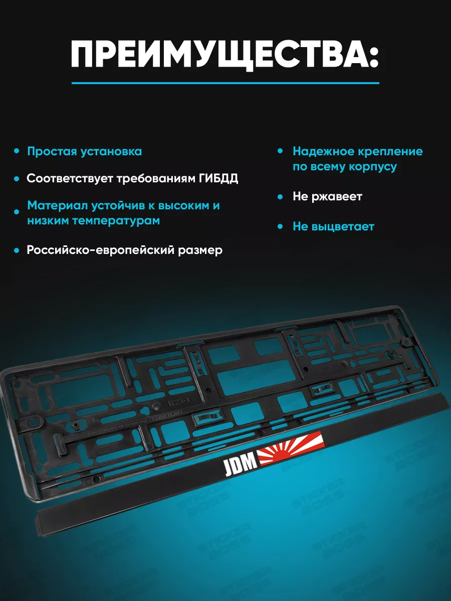 Размер 52×13×1 см позволяет использовать рамы с большинством стандартных блоков гос номера. На лицевой стороне нанесена УФ-печать, устойчивая к выцветанию и выгоранию, принты и надписи сохраняют яркость со временем. Рамки выполнены в черном цвете в стиле бренда Stickerboss, что подчеркивает внешний вид авто.