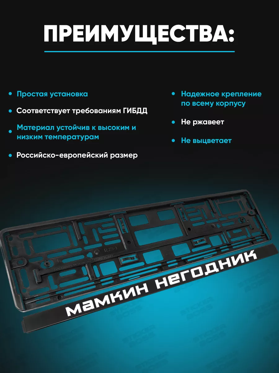 Рамки предназначены для крепления номерного знака на автомобильном бампере. Они соответствуют требованиям ГИБДД и имеют Российско-европейский размер. Вы можете выбрать любую рамку с надписью, перейдя в каталог Stickerboss. Этот автотовар — отличная идея подарка другу.