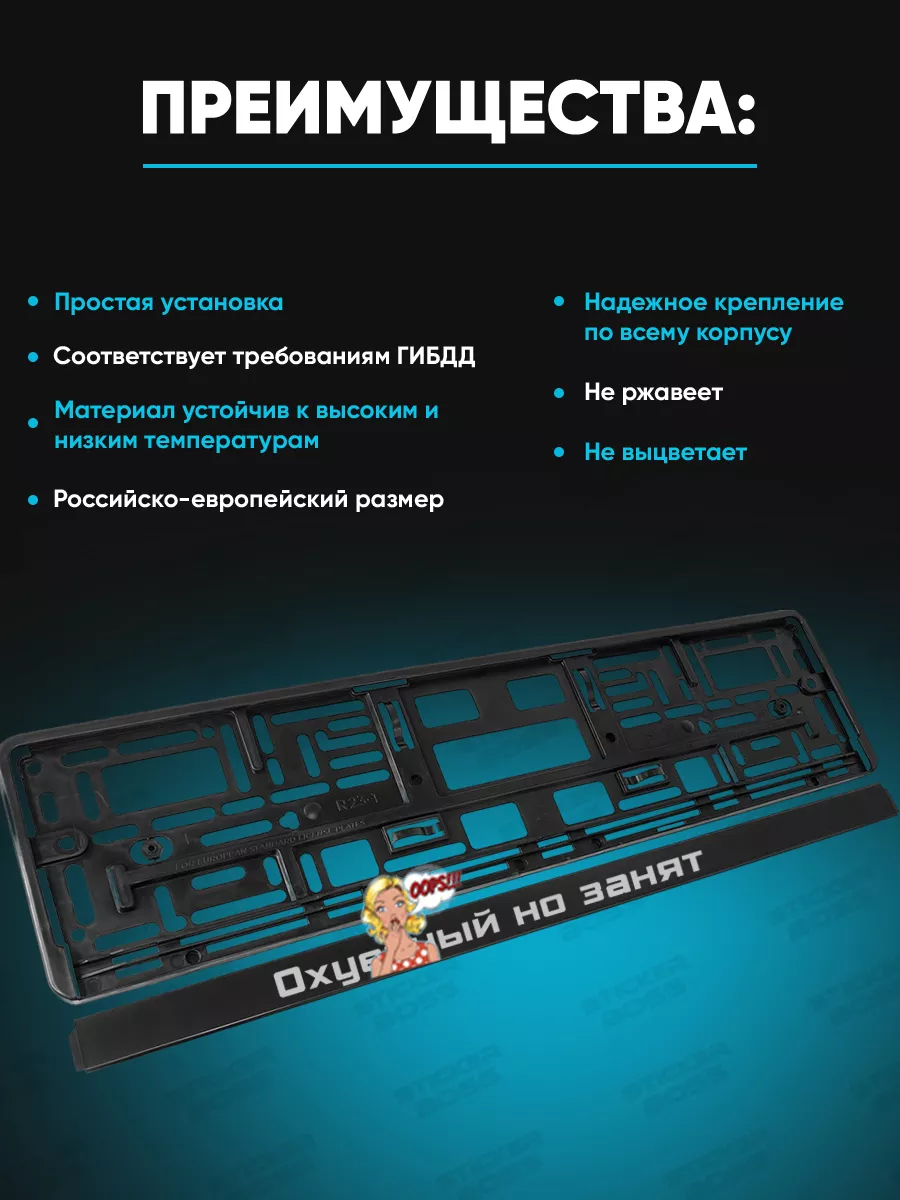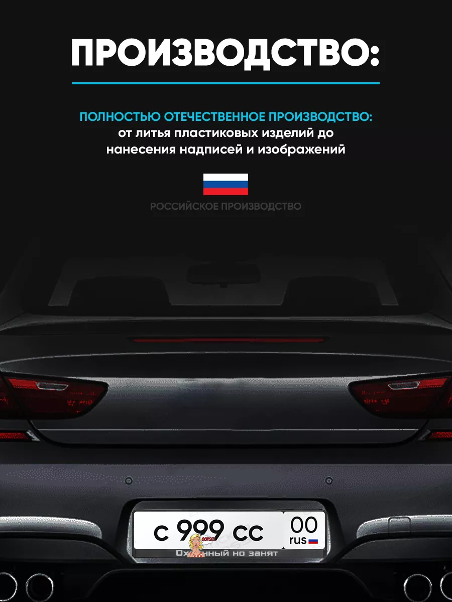 Рамки для гос номеров представляют собой две универсальные рамки из ABS-пластика, рассчитанные на размер 52x13 см. УФ-печать обеспечивает стойкость к солнечному свету, осадкам и износу, поэтому принты не выгорают и не тускнеют со временем. Эти рамки не только служат креплением номера, но и визуально улучшают вид автомобиля.