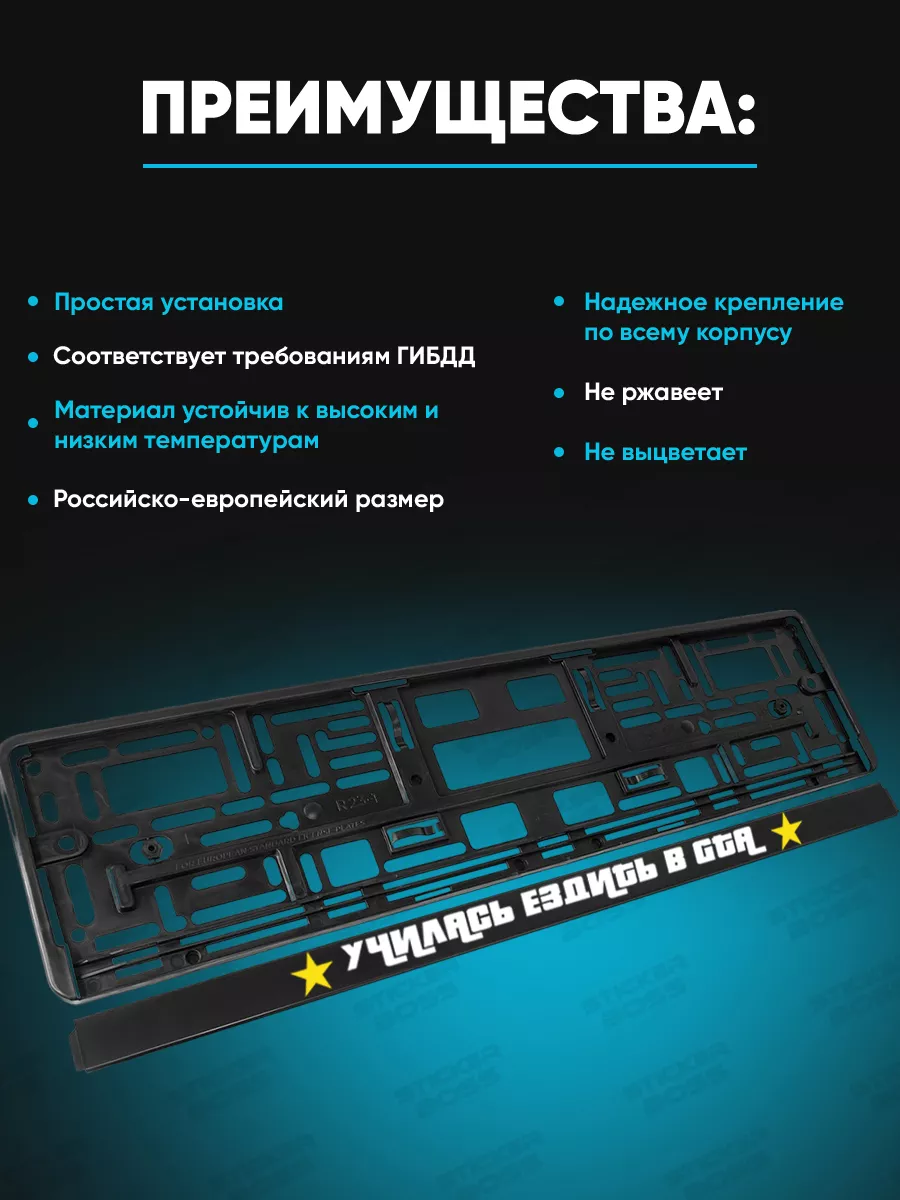 Эти рамки для госномеров предназначены для большинства легковых автомобилей. Изготовлены из ABS-пластика, устойчивого к погоде, ультрафиолету и повседневному износу. В декоративной части применена печать УФ-методом, которая не выгорает и не тускнеет со временем. В набор входит 2 рамки черного цвета с надписью Училась ездить в GTA, выполненными в стиле Stickerboss. Крепление механическое, рамка плотно прилегает к бамперу и обеспечивает долговечную фиксацию номерного знака.
