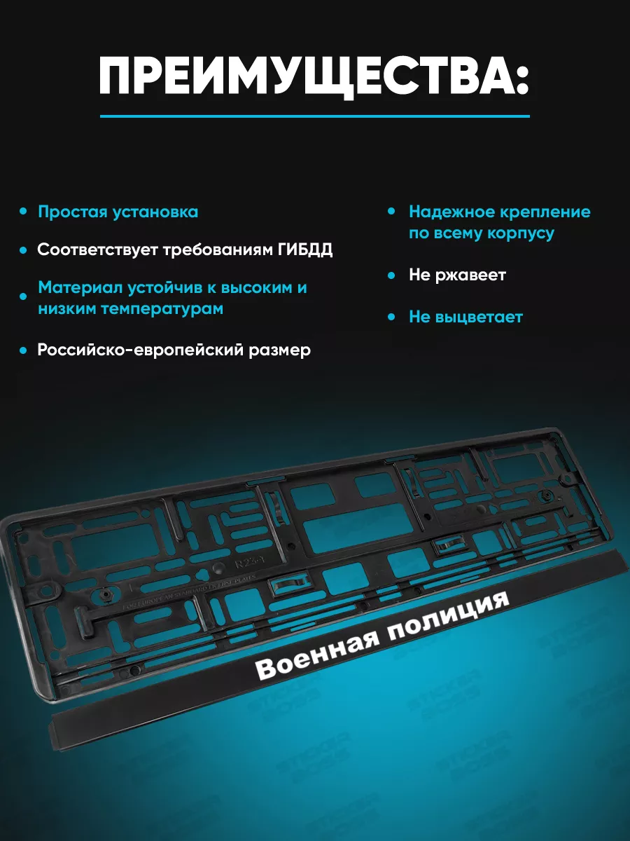 Преимущество рамки для госномера — защита знака и дополнительный стиль на вашем автомобиле. Рамка изготовлена из прочного ABS-пластика и рассчитана на длительную службу в любых климатических условиях. УФ-печать обеспечивает стойкость принтов к солнечному свету и выцветанию, а крепление надёжное, номер плотно фиксируется и не дребезжит во время движения.