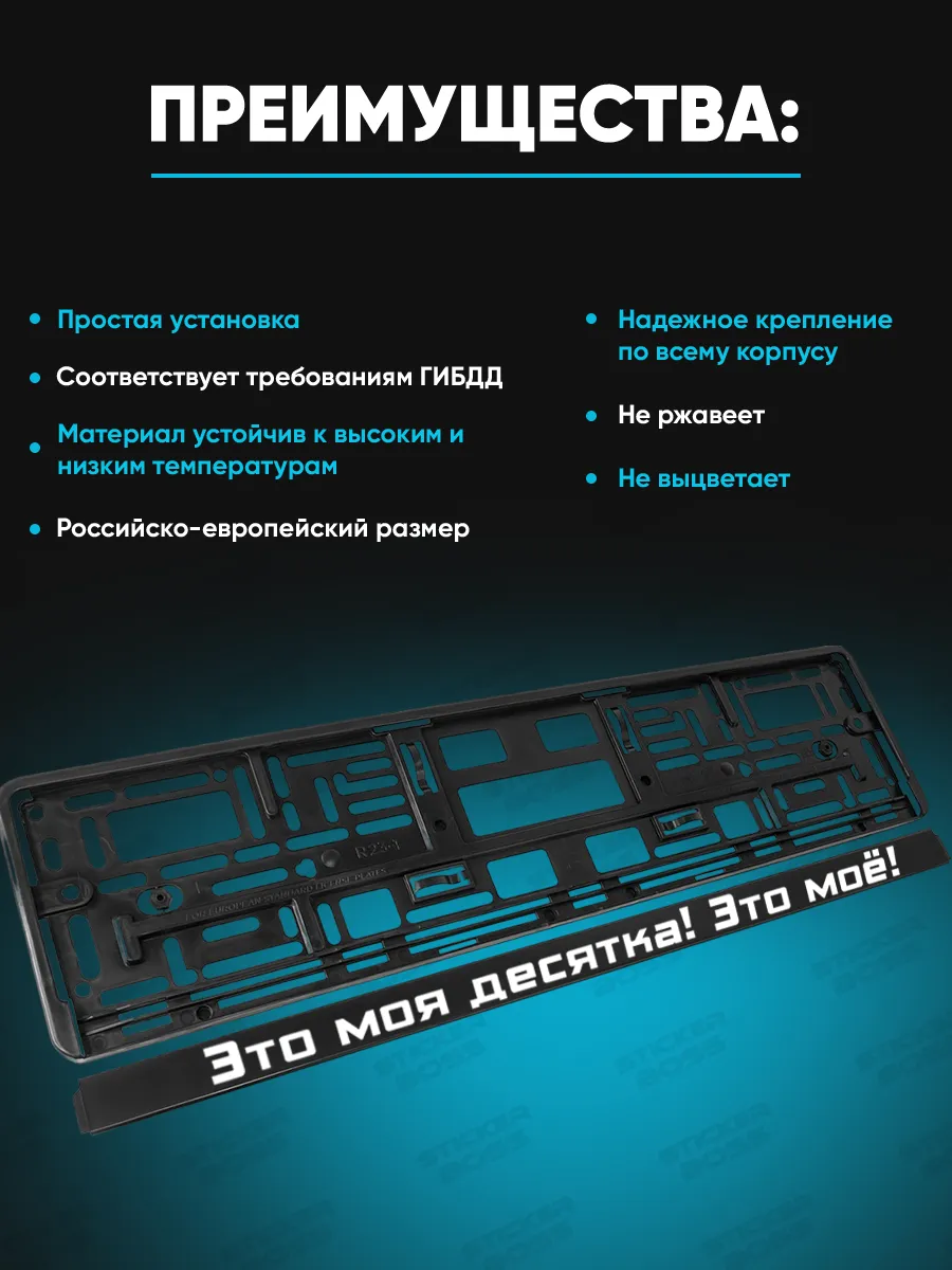 Изготовлены из ABS-пластика. На лицевой стороне выполнена печать методом УФ-печати, что обеспечивает устойчивость к солнечному свету и погодным условиям. Дизайн ориентирован на стиль Stickerboss. Комплектация — 2 рамки, крепление механическое, рамка плотно прилегает к бамперу, что обеспечивает долговечность и аккуратный вид.