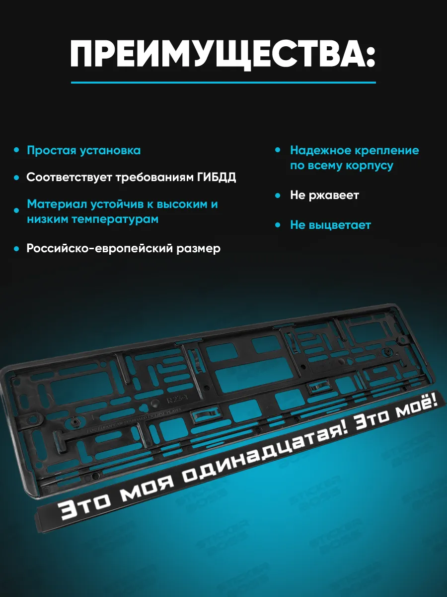 Рамки для номера — универсальное решение для крепления госномерного знака на автомобиле. Изготовлены из ABS-пластика и имеют размер 52×13×1 см, комплект поставки включает 2 рамки. УФ-печать обеспечивает стойкость к солнечному свету, погодным условиям и перепадам температуры. Производитель указан в описании бренда Stickerboss.