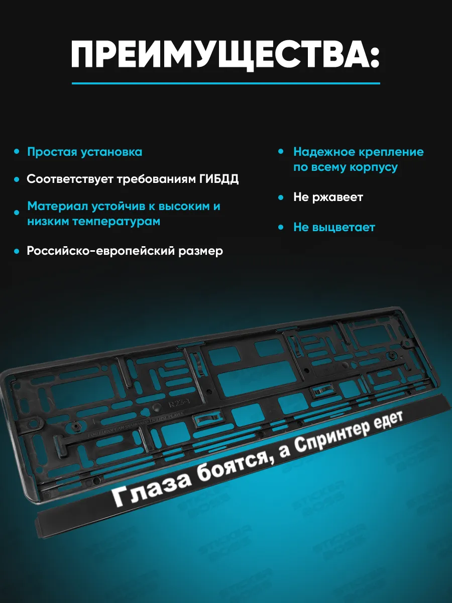 Рамка для ГОС номера универсальная и практичная деталь автомобиля. Изготовлена из ABS-пластика размером 52×13×1 см; лицевая сторона оформлена УФ-печатью, стойкой к погодным условиям и не выгорает со временем.