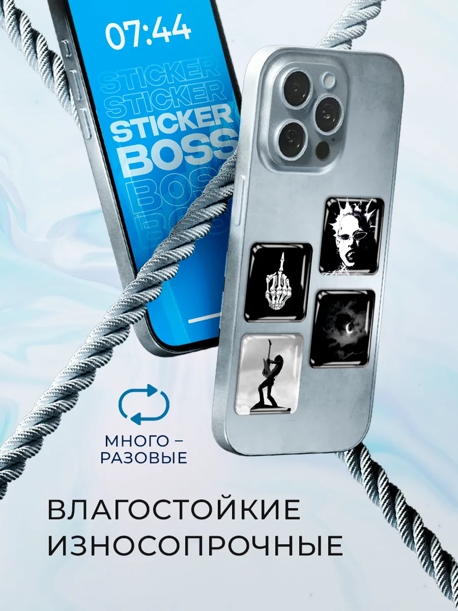 6 наклеек в одном наборе; каждый элемент имеет 3D-эффект для впечатляющего вида. Клеевая основа прочная, но при желании снимаются без следов. Наклейки подходят для чехла iPhone, а благодаря универсальному дизайну — и для других плоских поверхностей.