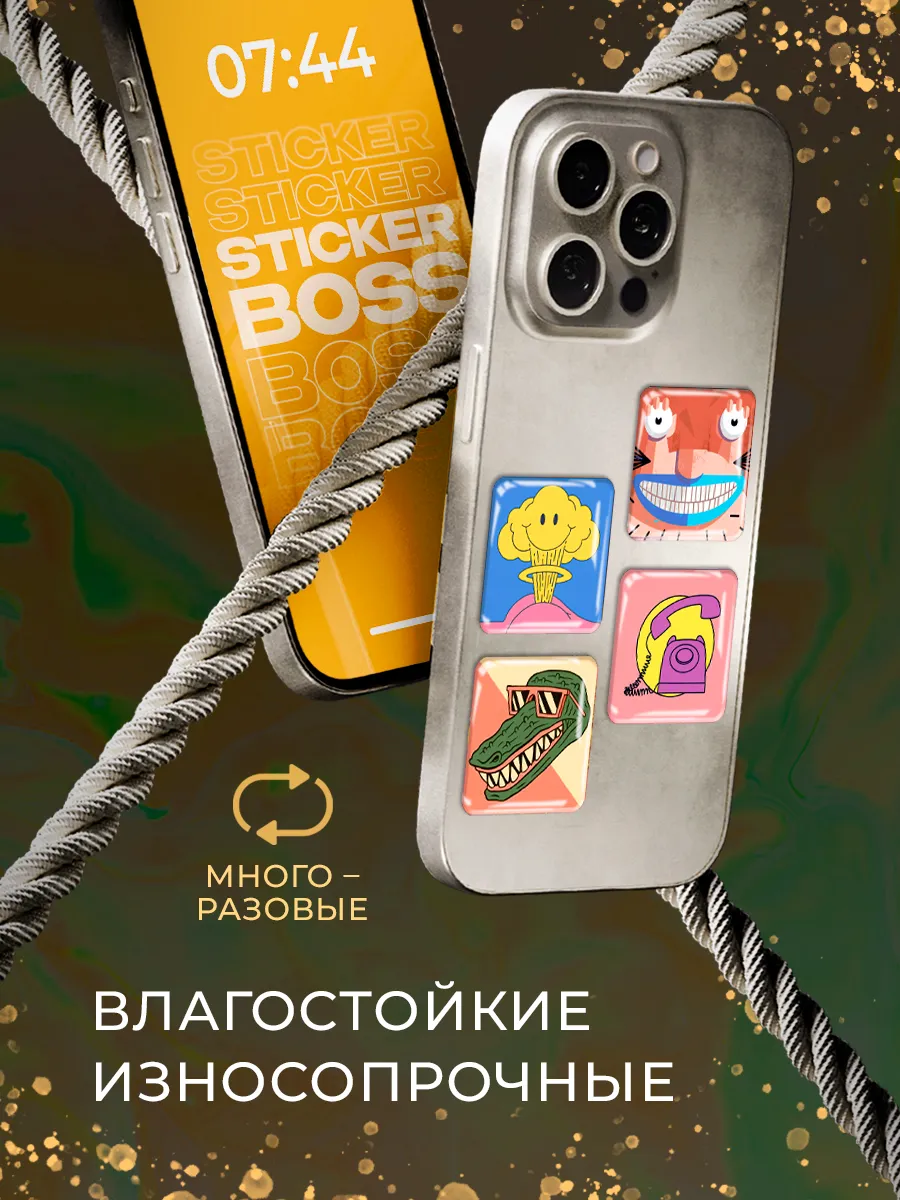 6 штук в наборе, объемные 3D-наклейки с уникальным дизайном, дружелюбны к поверхностям и просты в использовании. Бренд Stickerboss известен качеством печати и стойкими цветовыми решениями. Наклейки подходят как для чехлов iPhone, так и для чехлов Android‑устройств (Samsung, Huawei, Honor, Xiaomi) и любых плоских поверхностей.